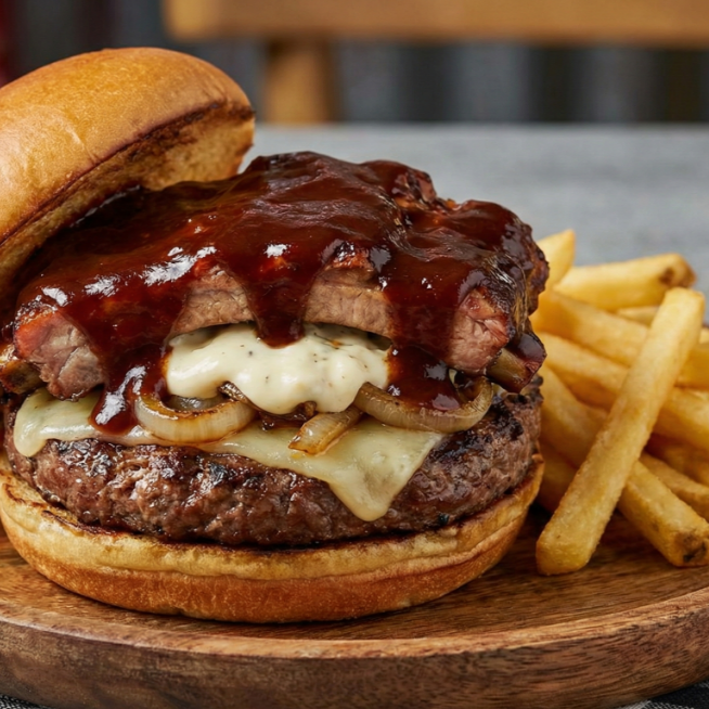 150 g De carne de hamburguesa, cebolla asada a la parrilla, queso manchego, alioli de ajo y costilla sin hueso bañada en salsa BBQ. Incluye papas fritas.