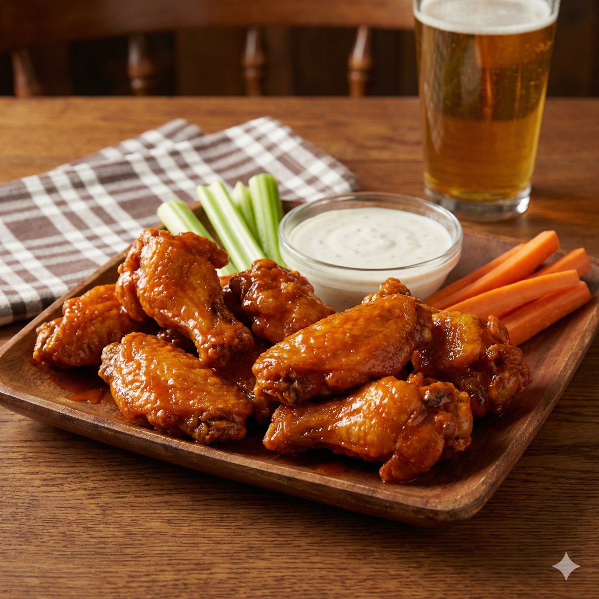 Orden de 300 g de alas de pollo (de 7 a 10 alas depende el tamaño) fritas, bañadas en salsa de su elección, acompañadas de aderezo ranch.