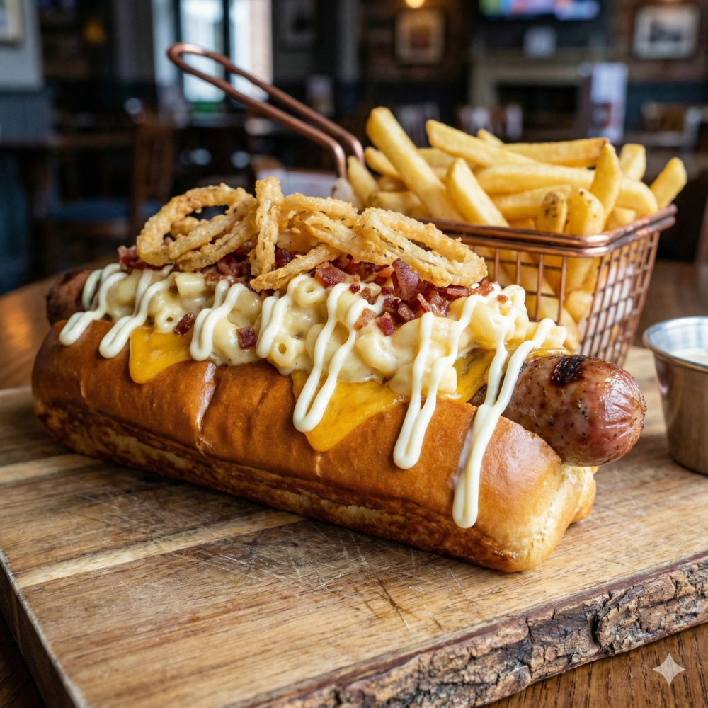 Salchicha de res, 150 g de mac and cheese, tocino, cebolla frita crujiente, queso amarillo y mayonesa. Incluye papas fritas.
