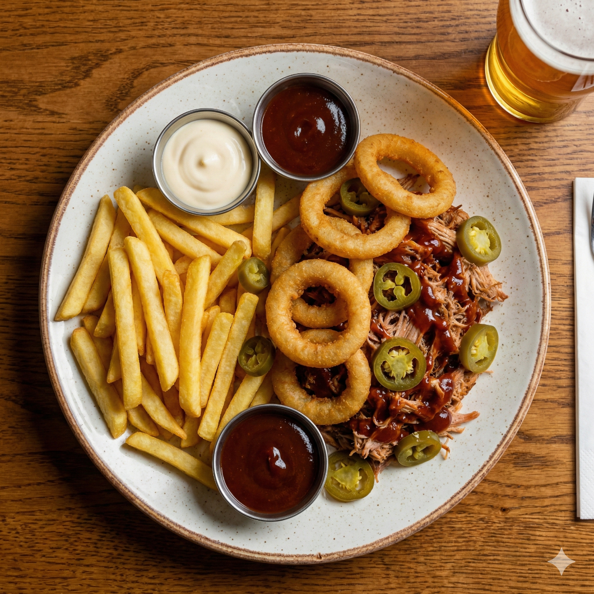 250 g De papas fritas y 150 g de pulled pork, aros de cebolla tradicionales, jalapeños, aderezo de mayonesa y salsa BBQ.
