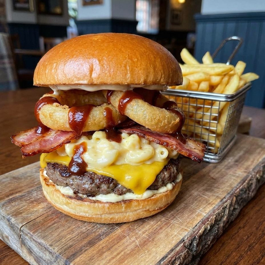 150 g De carne de hamburguesa, 150 g de mac&cheese, tocino, queso amarillo, aros de cebolla, tempura, salsa BBQ y mayonesa. Incluye papas fritas.