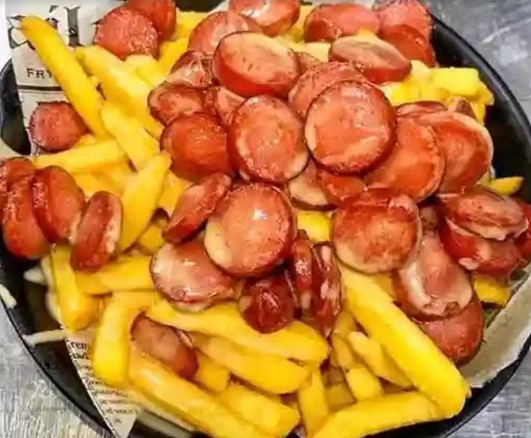 La combinación infalible de papas fritas y rodajas de salchicha doradas. ¡Para compartir o disfrutar solo!