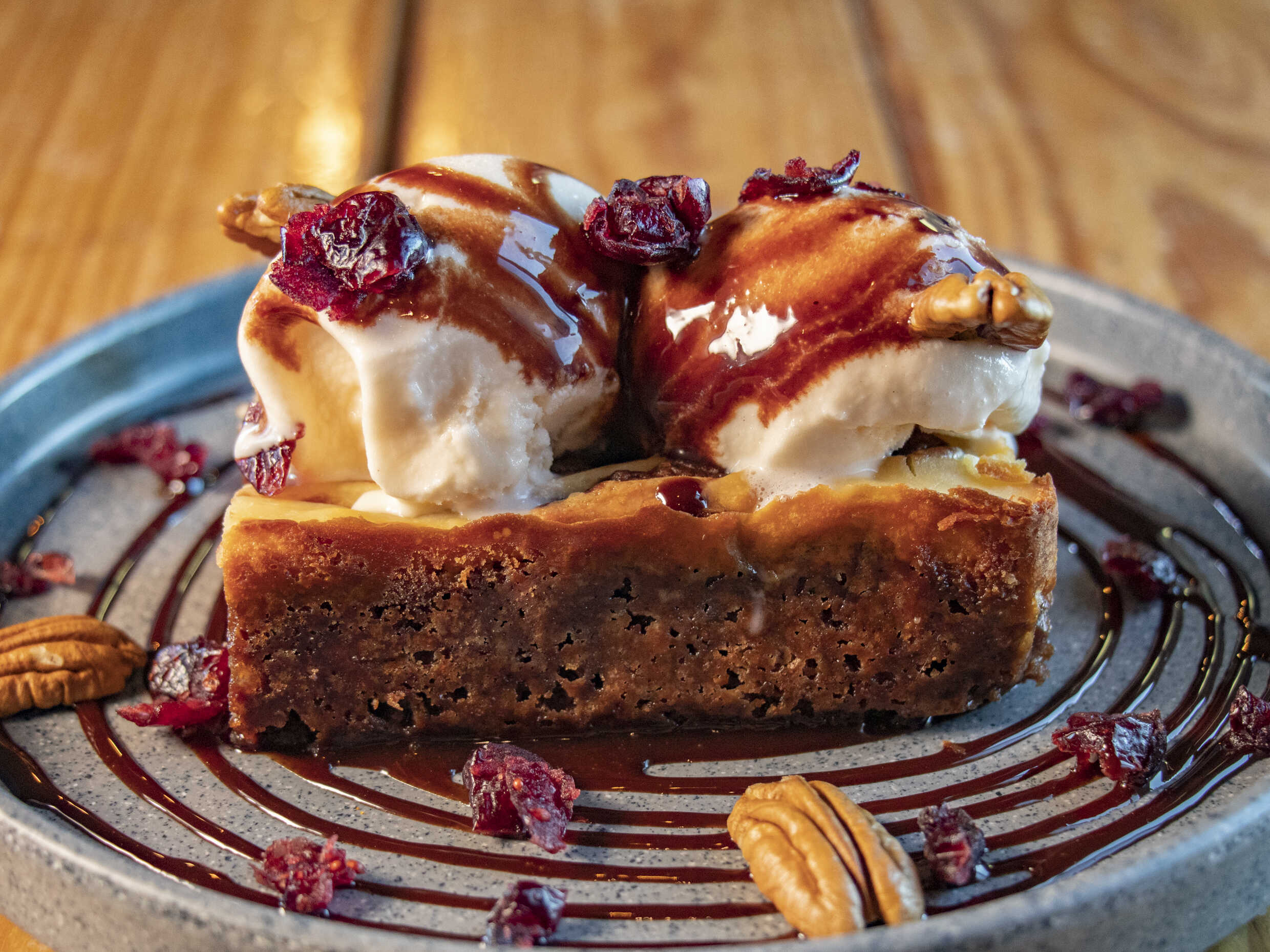 Mediana, manzana caramelizada, arándanos, queso crema y nuez.