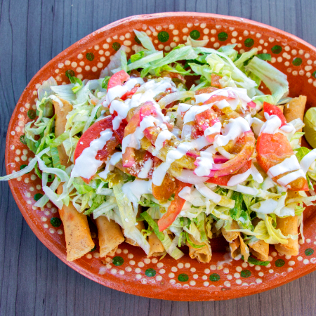 8 Tacos dorados surtidos de: pollo, papas y rajas. acompañado de la verdur a tu elección.