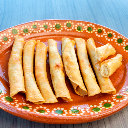8 tacos dorados con tortilla delgada y pollo preparado con especies.