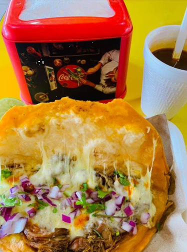 Tortilla de harina doradita con queso y birria. Incluye consomé en pedidos de 2.