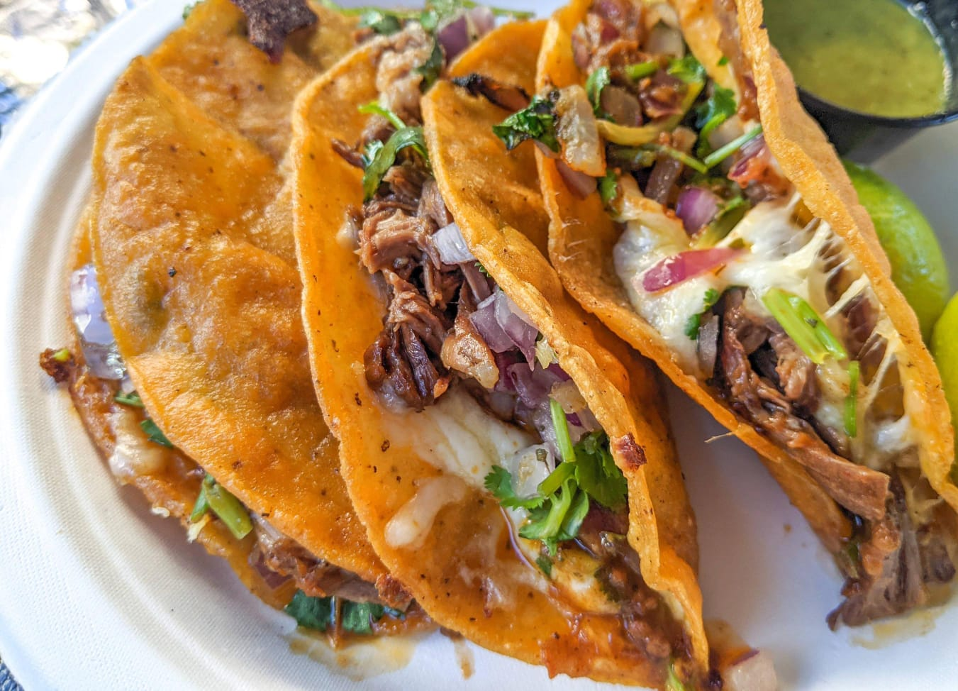 Taco doradito con doble tortilla. Incluye consomé en pedidos de 2.