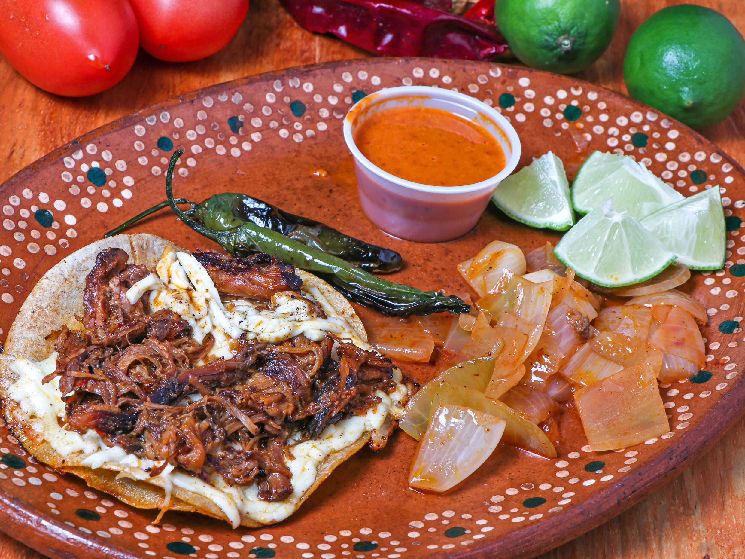 Burro de Birria con Queso acompañado de Cebollas asadas limones y salsa