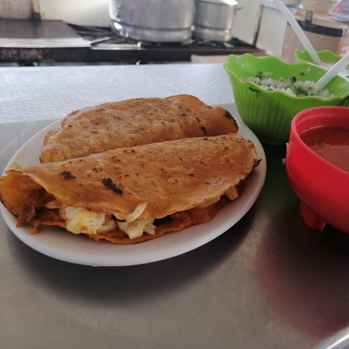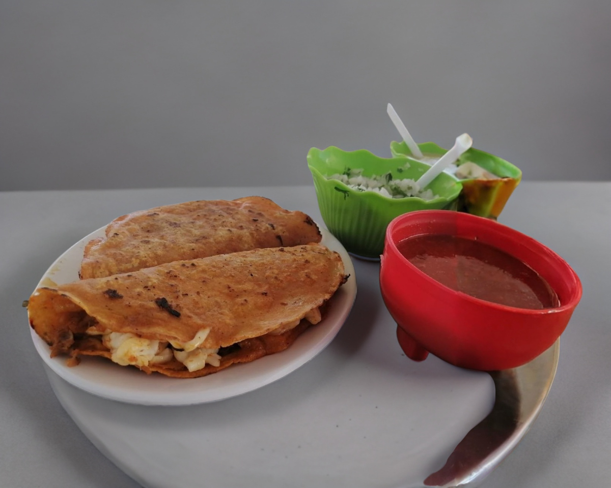 Quesadilla con carne de birria y queso tipo asadero acompañada de cebolla con cilantro limon y salsa