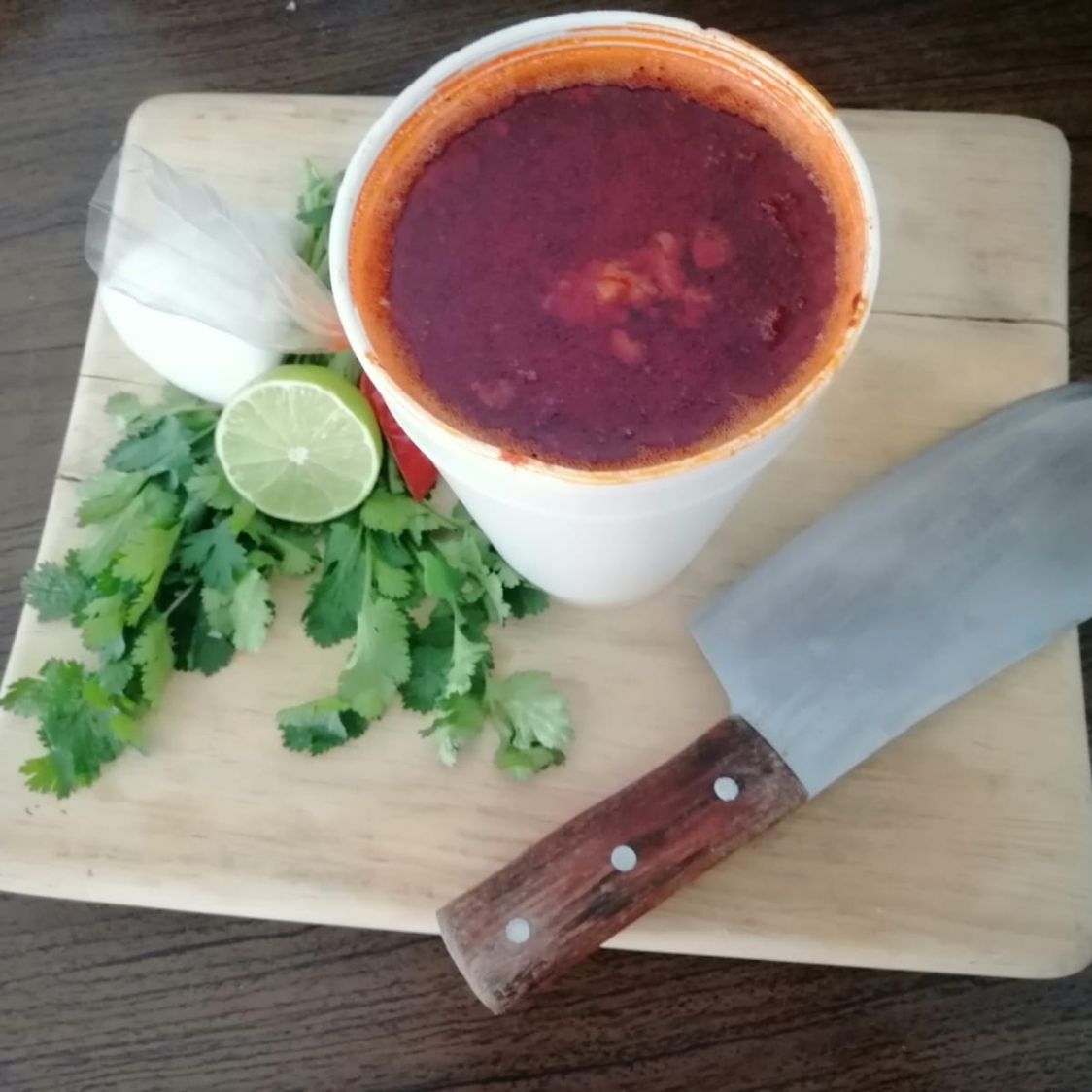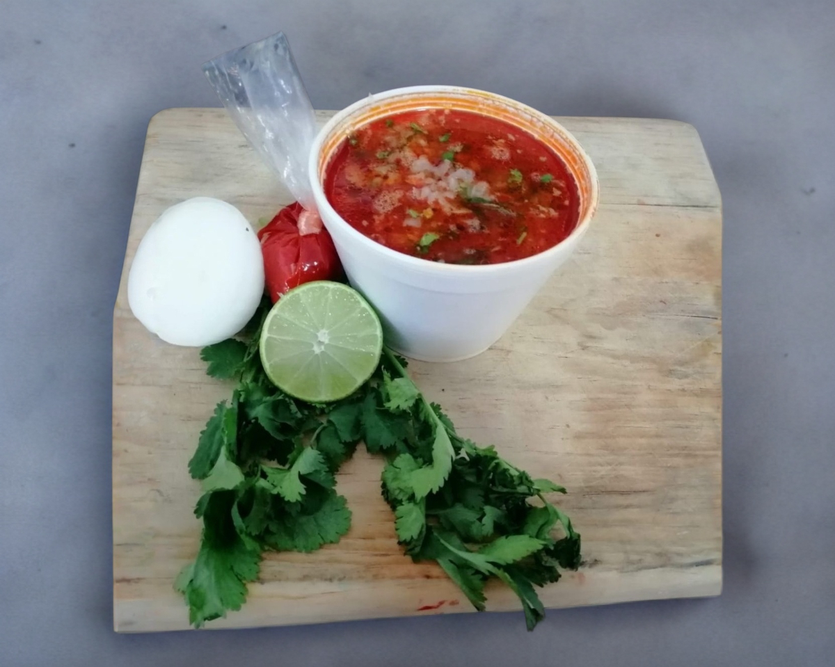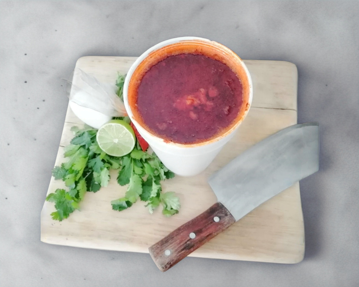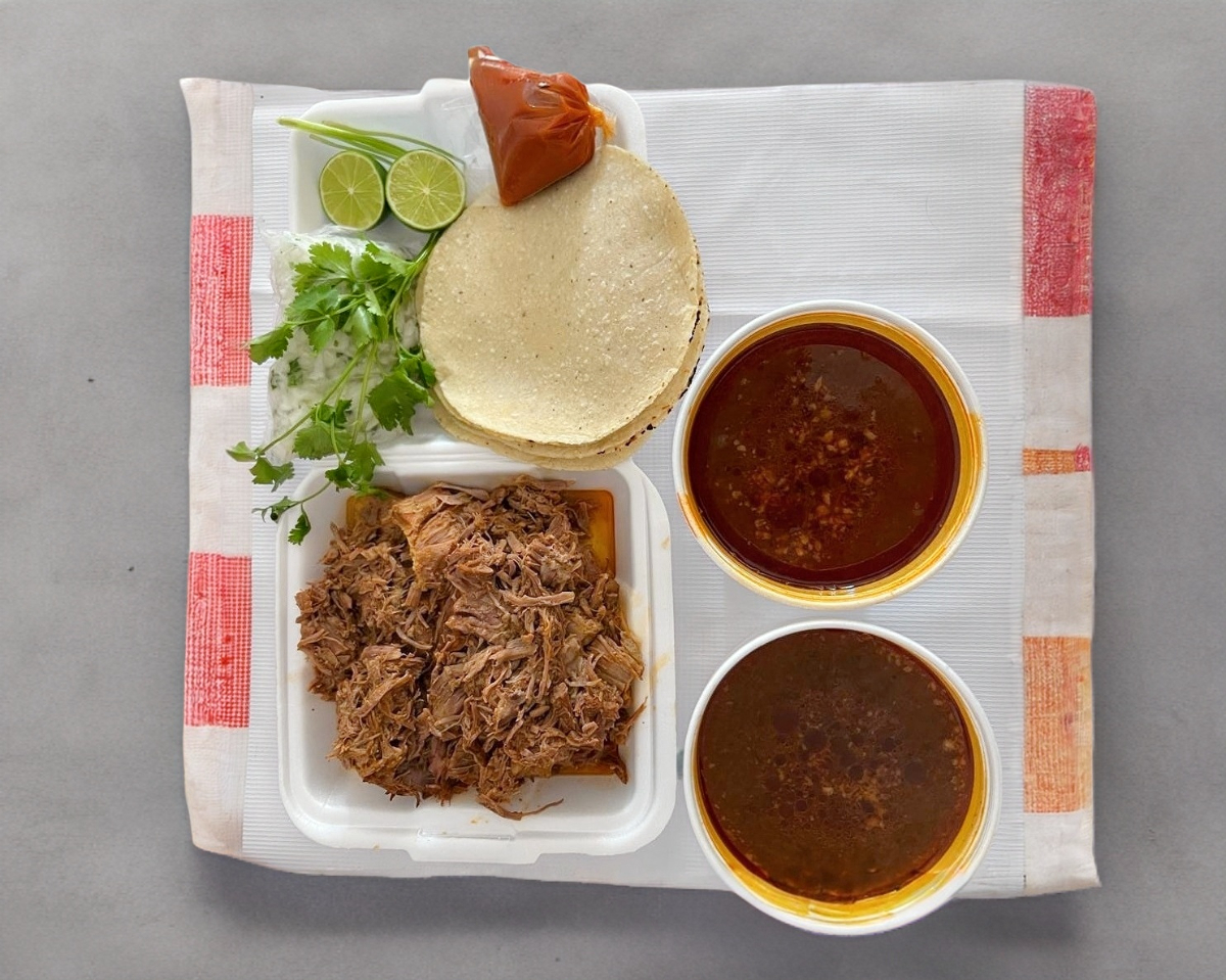 Litro de consomé de birria, com 250g de carne de res con 5 tortillas hechas a mano cebolla con cilantro salsa y limón.