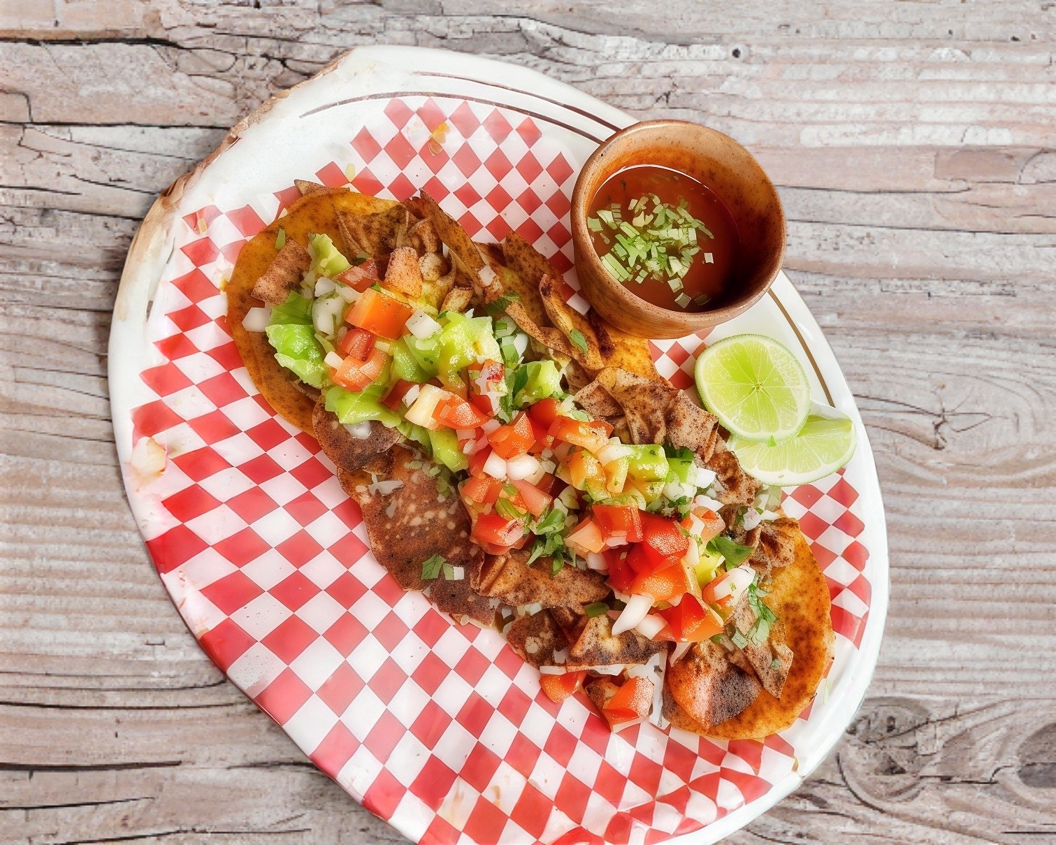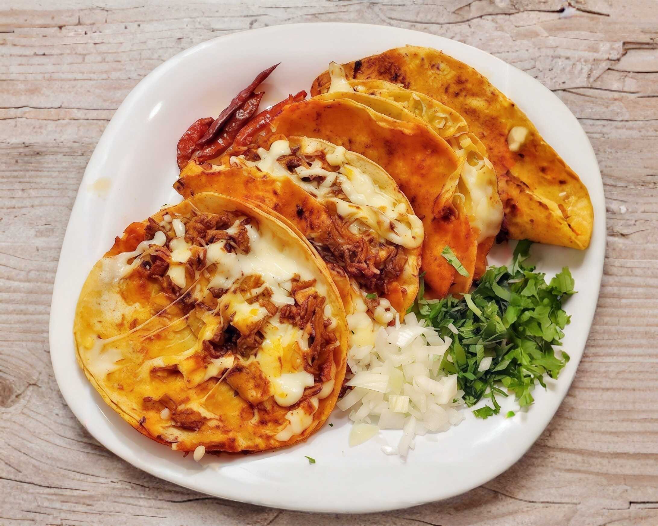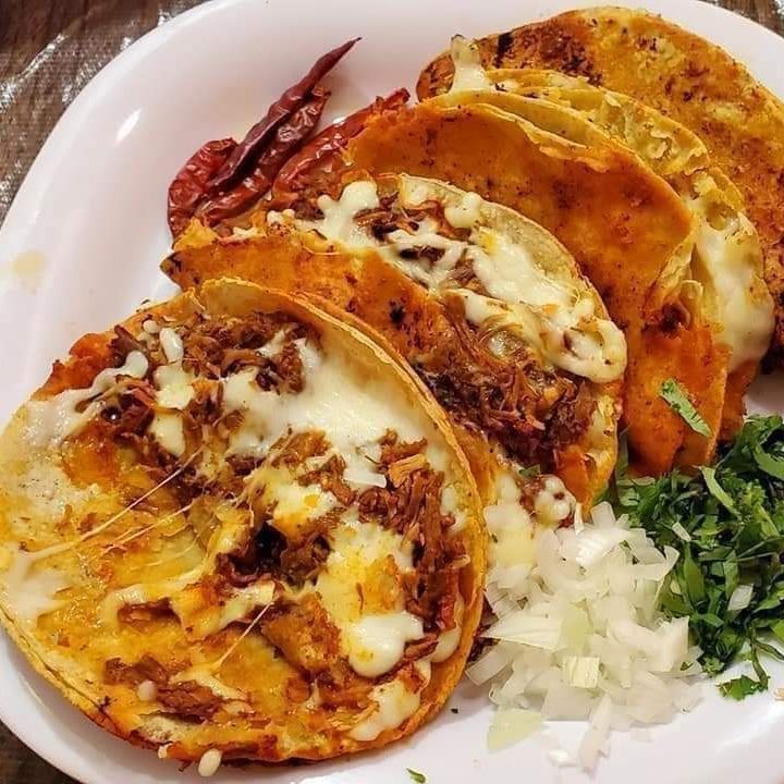 Exquisitos tacos a la plancha, revolcados (5 tacos) en el jugo y grasa de la birria, acompañado de consomé, cilantro, cebolla, limón y salsa picante.