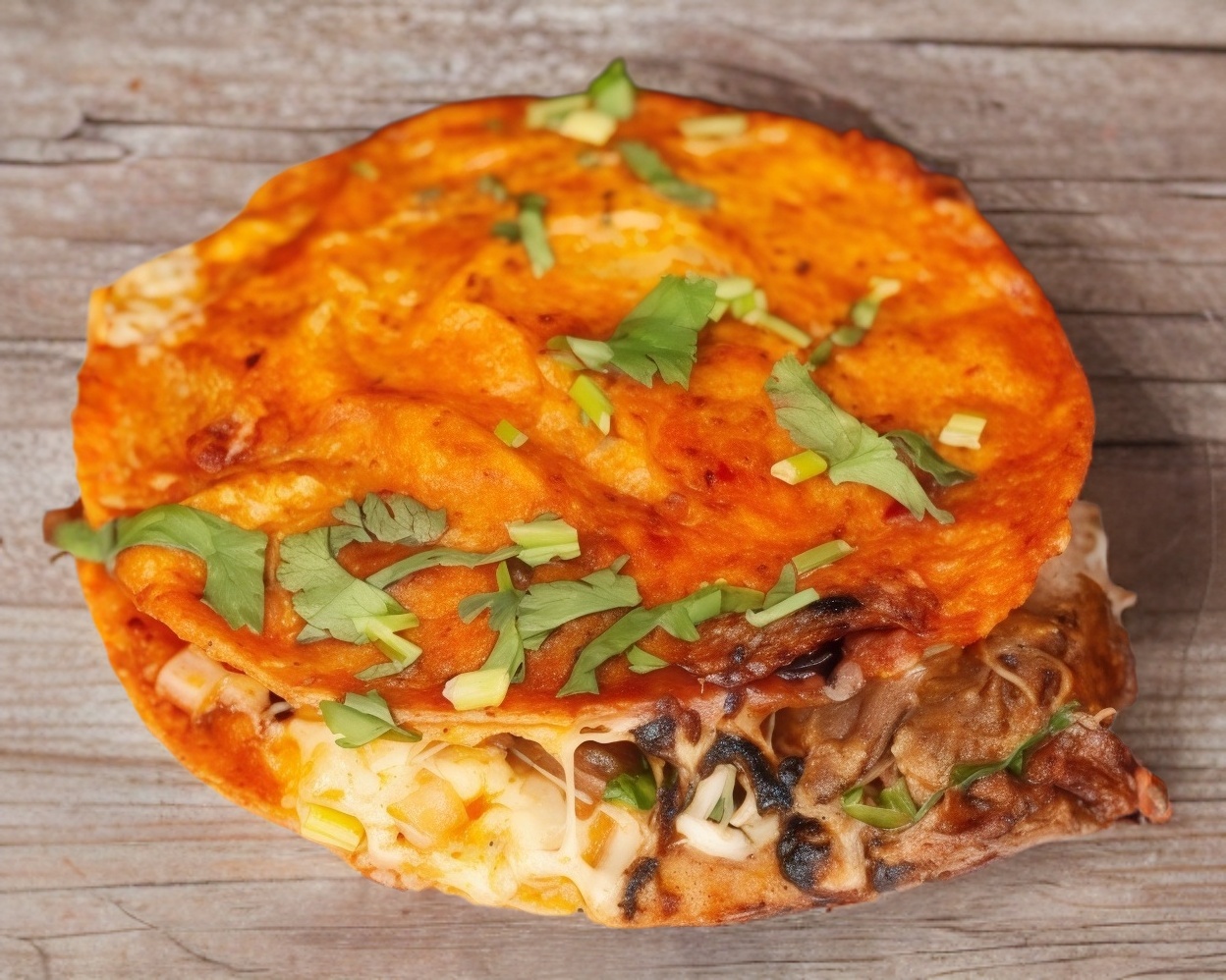 Quesadilla con doble tortilla de maíz doradita, birria, cilantro, cebolla, salsa y consomé.