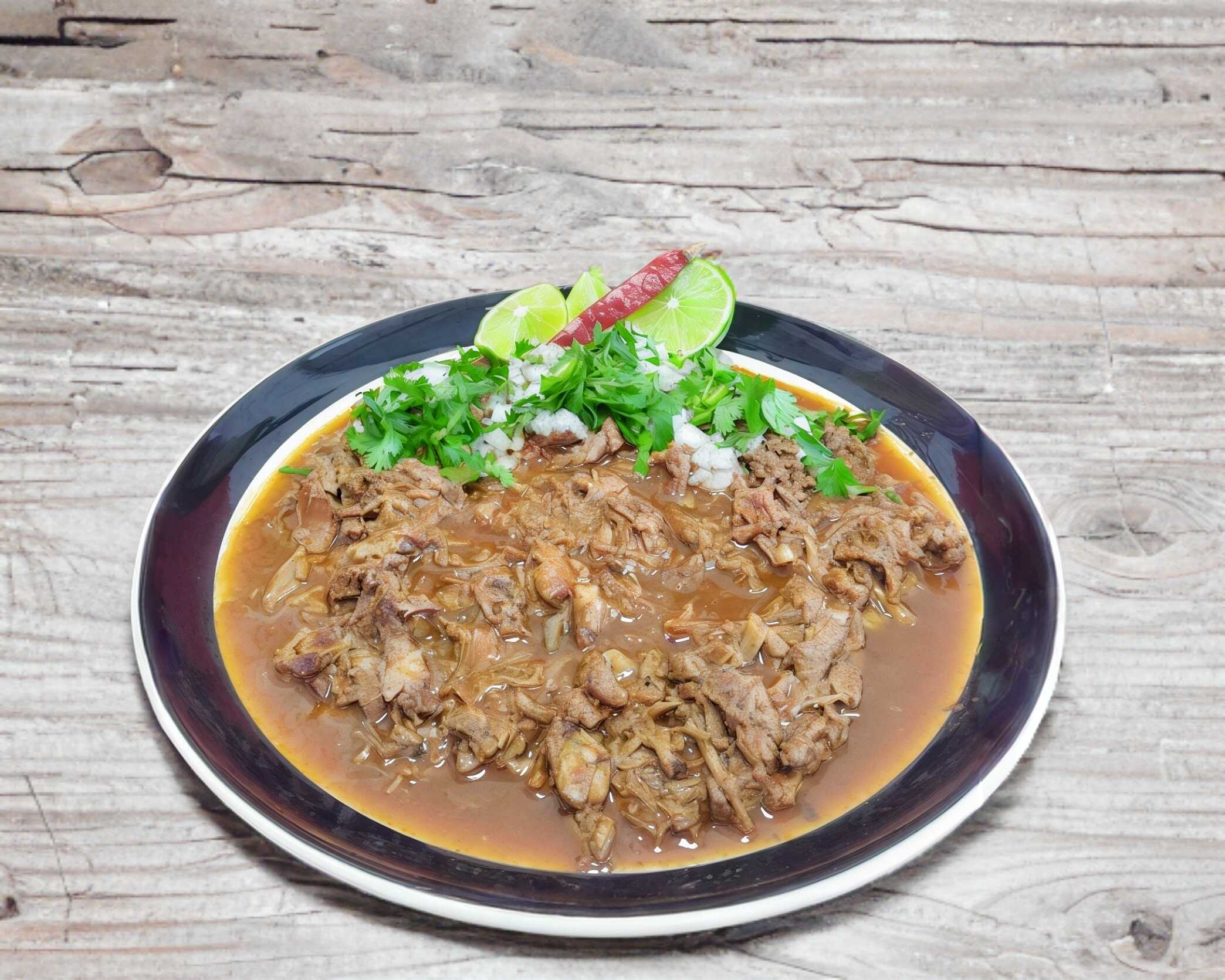 200 g De birria sumergida en su propio consomé (500 ml), acompañada de tortillas, cebolla, cilantro, limón y salsa picante.