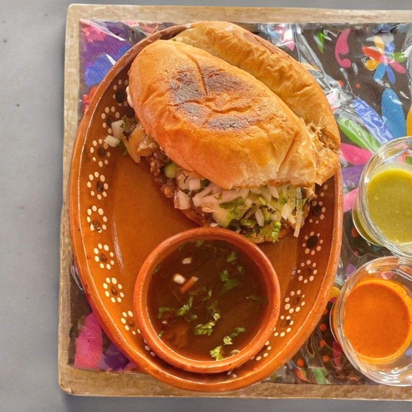 Pan fránces, aguacate, mayonesa, birria, queso y cebolla asada