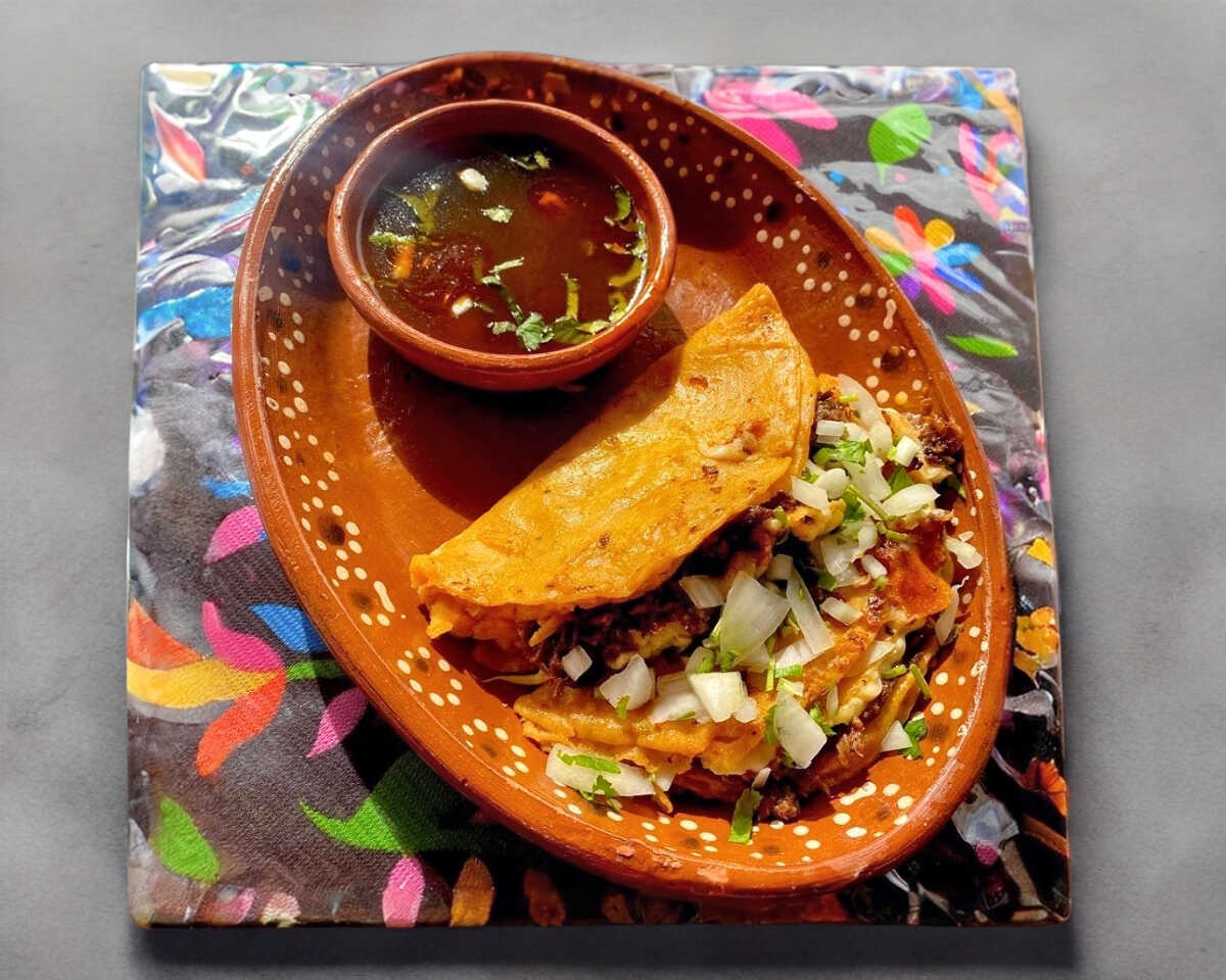 Quesadilla de harina bañada en consomé, acompañada de birria, queso y cebolla asada