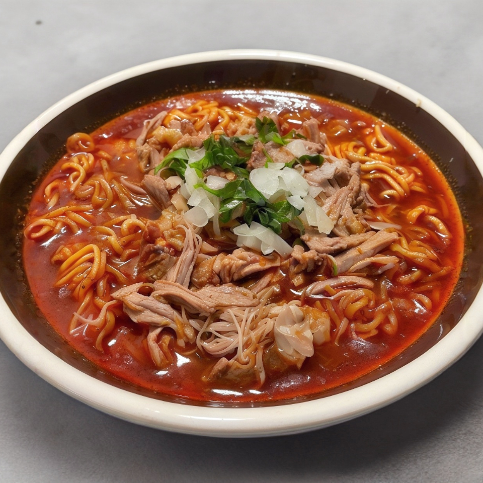Ramen preparado en el consomé de la birria, acompañado de carne