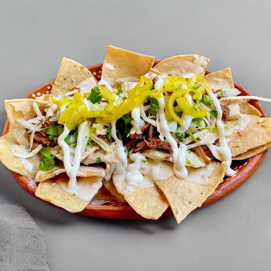 Totopos bañados en salsa cremosa de habanero, acompañados de birria, queso y crema