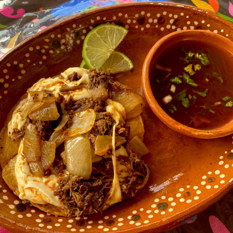 Tostada de maiz acompañada de birria, queso y cebolla asada