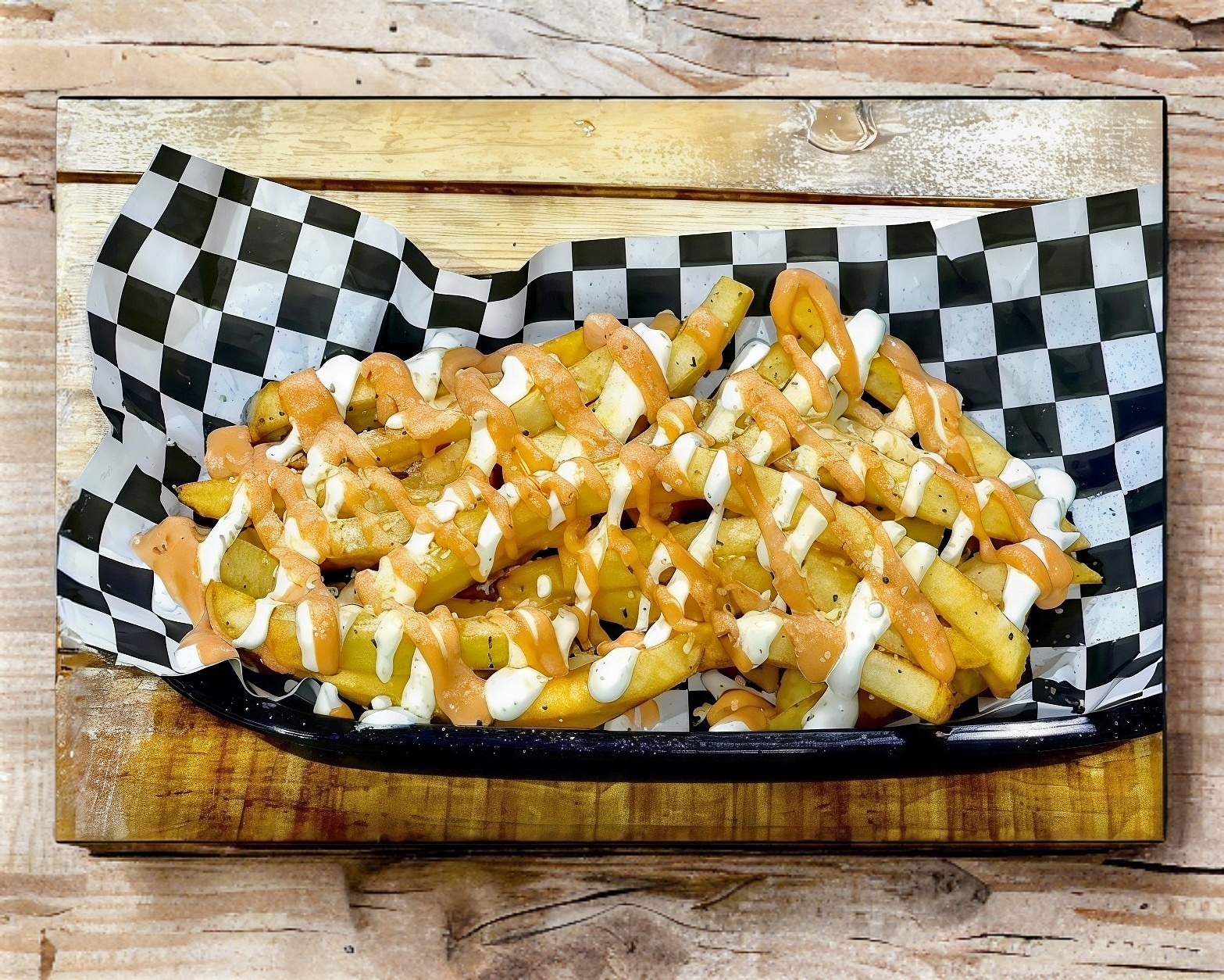 300 gr de papas fritas bañadas con aderezo chipotle y ranch. Encima una porción generosa de carne asada (res), cebolla asada y rodajas de chile jalapeño