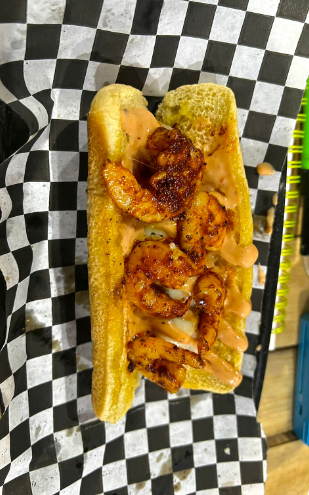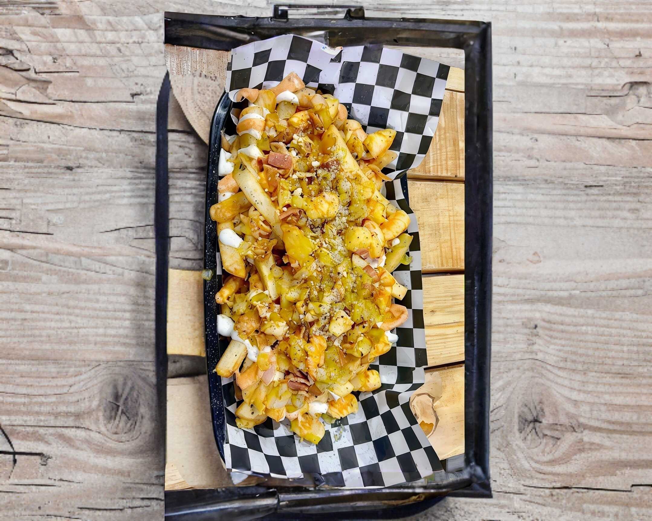 300 Gramos papas sazonadas, guiso de camarón, aderezo ranch, aderezo chipotle, queso parmesano.