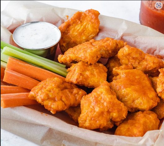 Boneless que vienen de la siguiente forma: 220g y vienen de 10 a 15 piezas + Jugosa pechuga de pollo frita bañada en salsa de la casa a elección. Acompañados con Zanahoria, Pepino y Aderezo ranch.