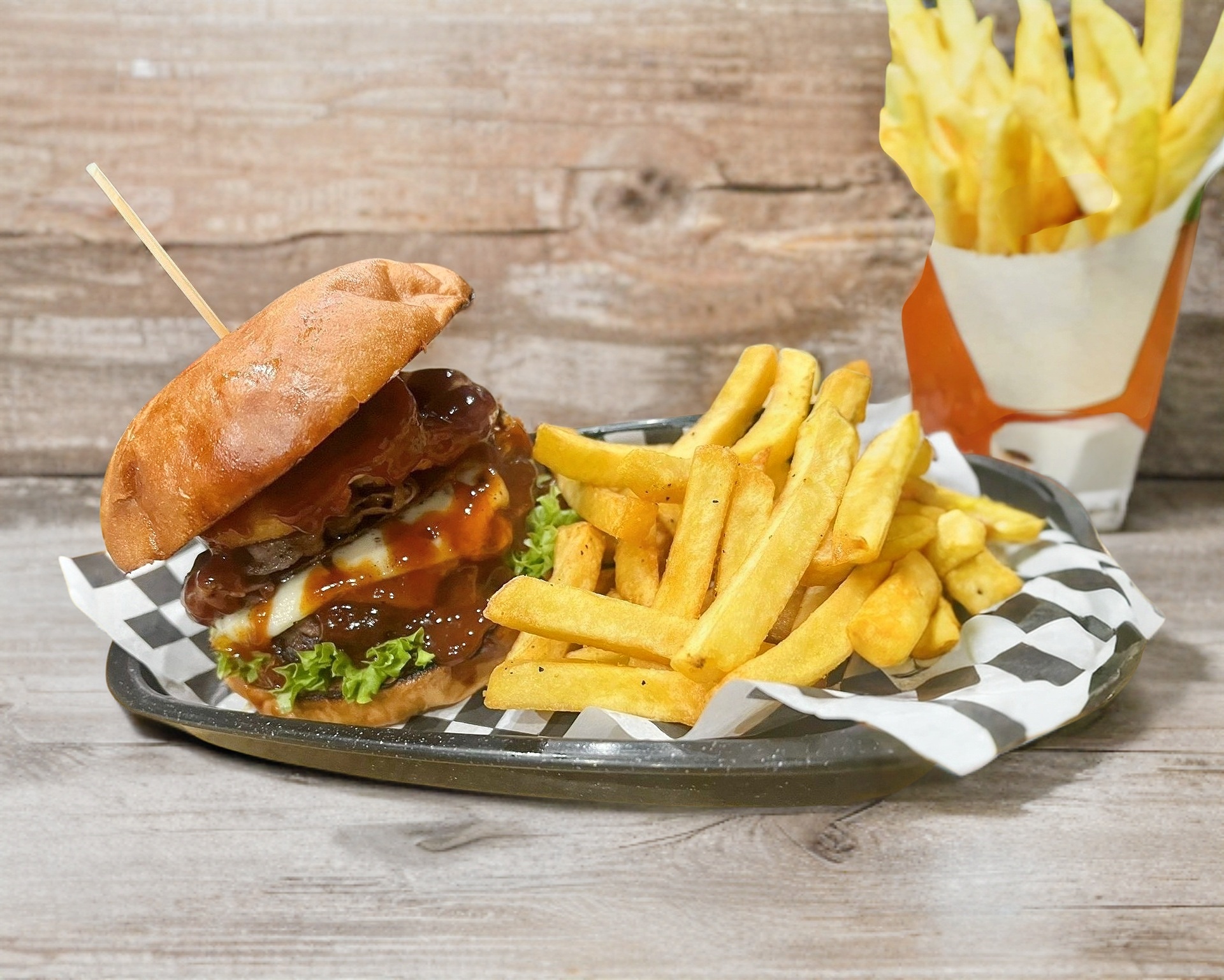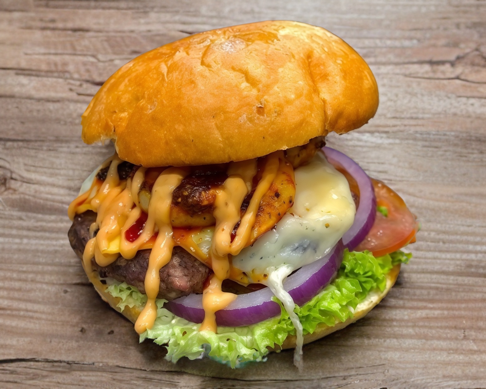 Hamburguesa con carnes de 120 gr, queso blanco, queso amarillo, aros de cebolla, tocino y salsa bbq
