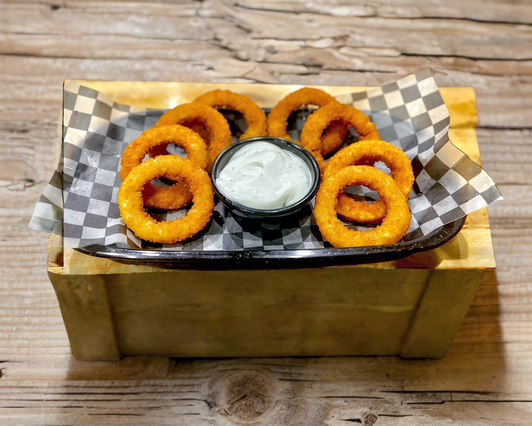 8 Piezas crujientes aros de cebolla empanizados acompañados con aderezo ranch.