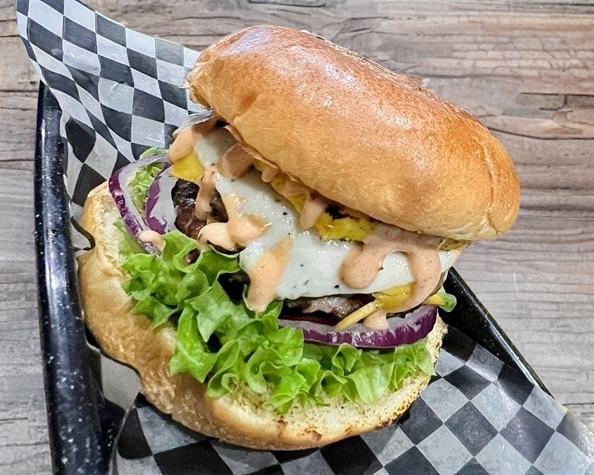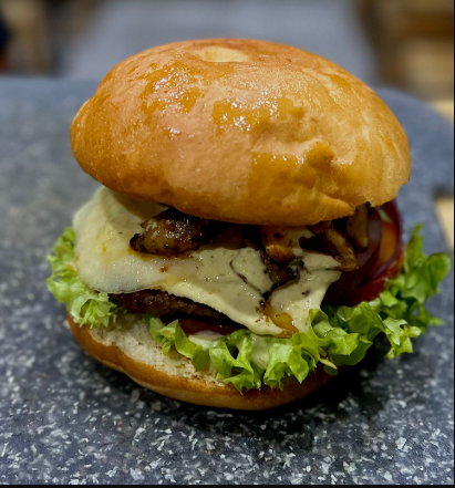 Hamburguesa con carne de 120 gr, queso blanco, queso amarillo, aros de cebolla, tocino, y salsa bbq