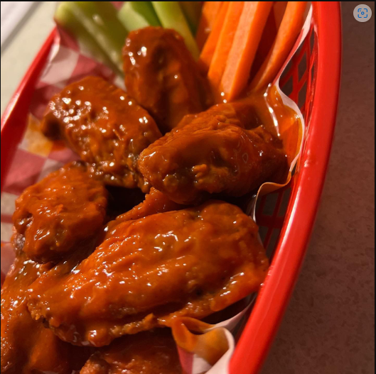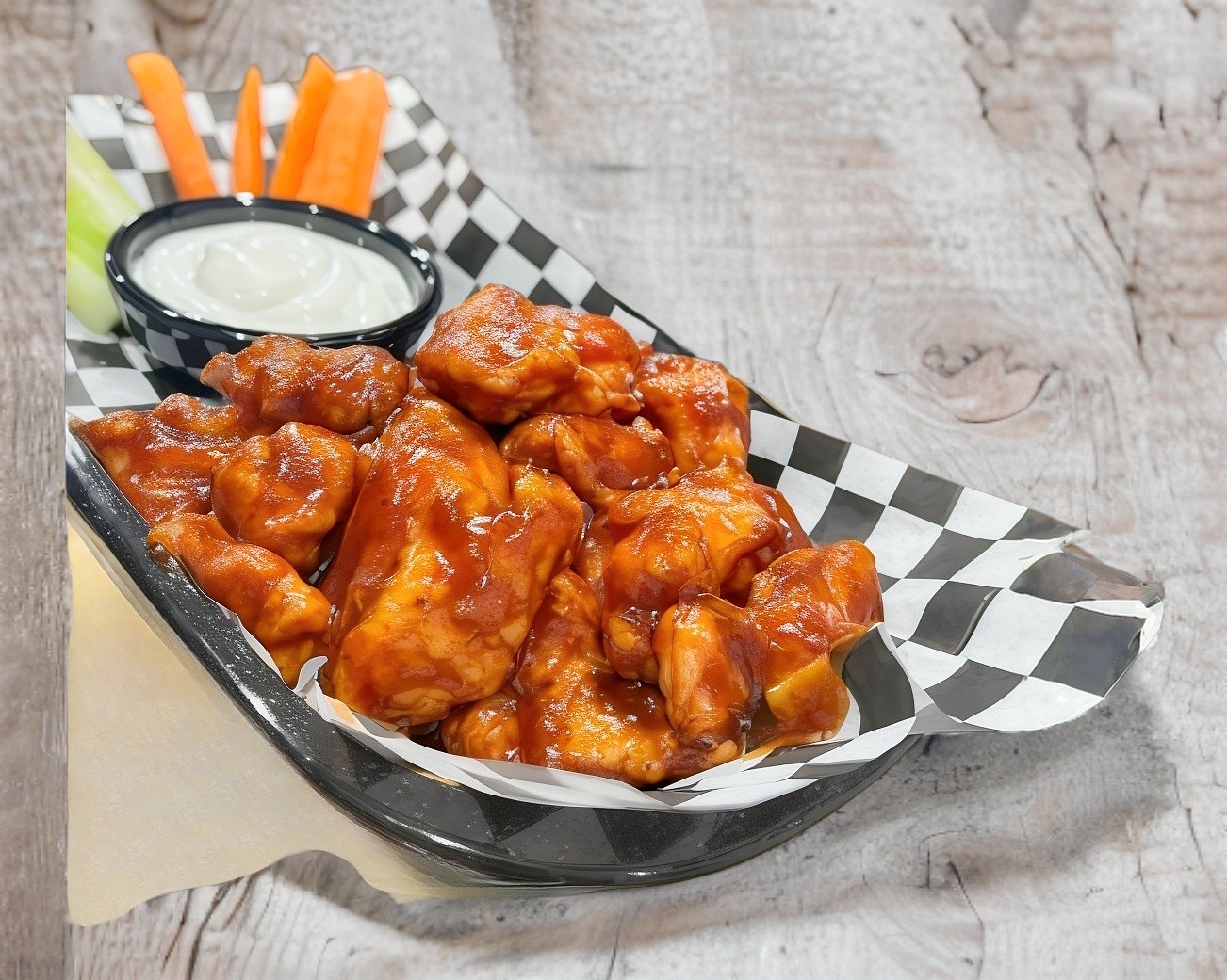 10 Alitas de pollo bañados en salsa de la casa a elegir. Acompañadas con zanahoria, pepino y aderezo ranch.
