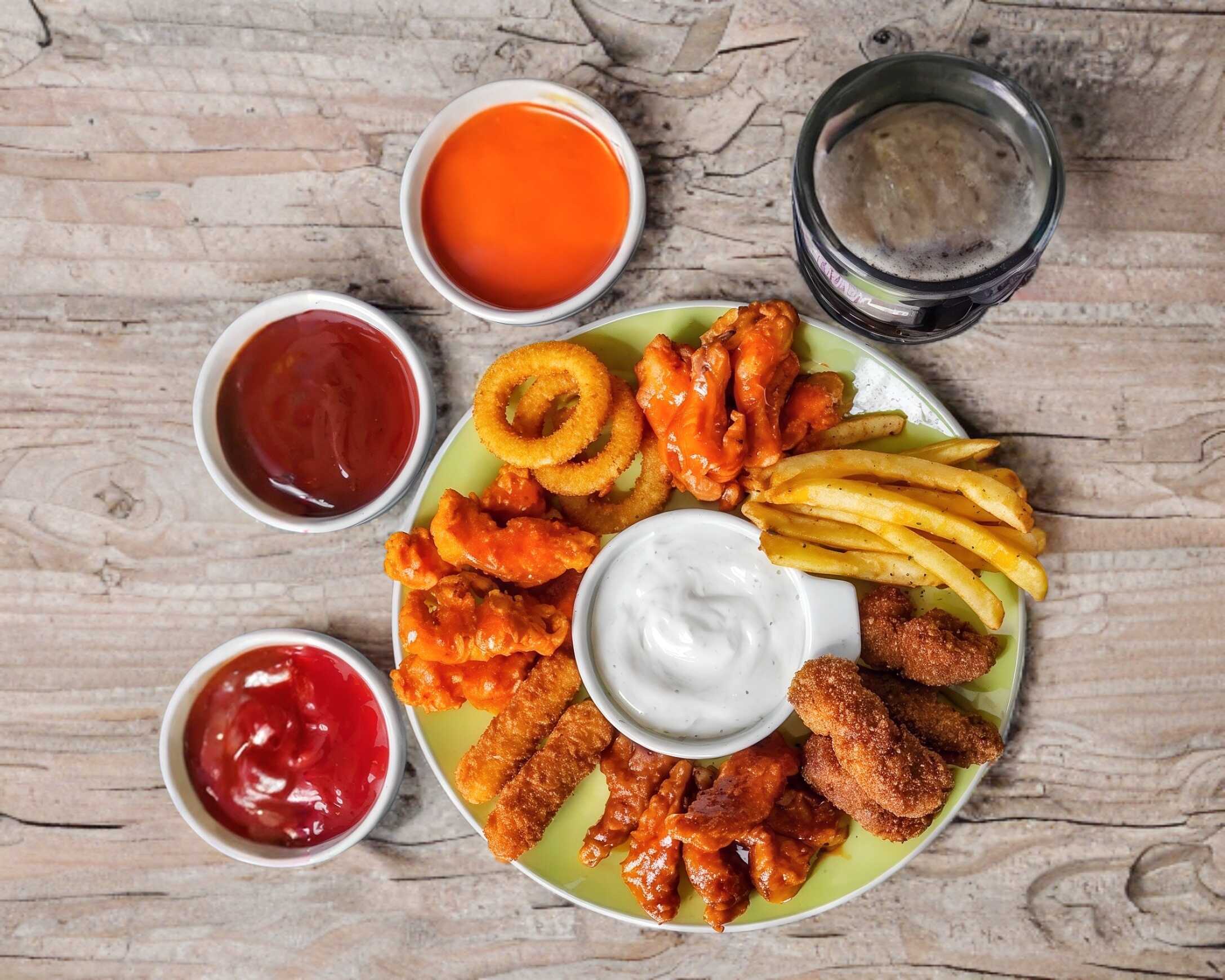 1 Orden de alitas, 1 orden aros de cebolla, 1 orden papas francesas. vegetales y aderezo ranch.