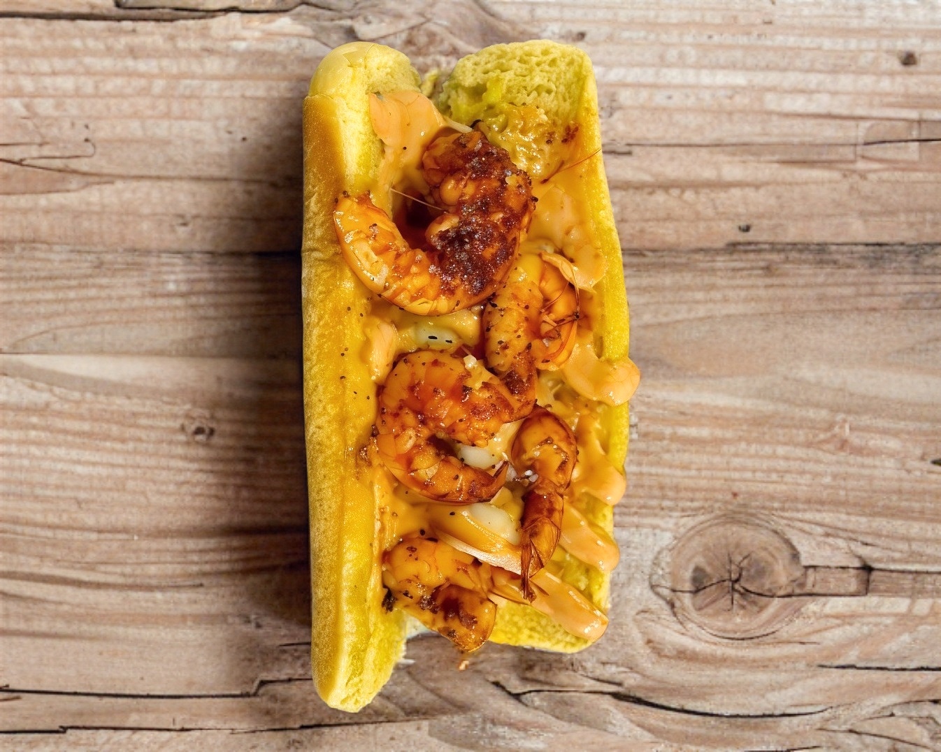 Lechuga, tomate, cebolla morada, carne 120 g, queso amarillo, camarones sazonadas y gratinados con queso blanco, aderezo chipotle.
