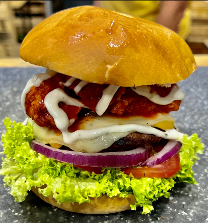 Lechuga, tomate, cebolla morada, carne 120 g, jugosa pechuga de pollo bañada en salsa buffalo de la casa, queso amarillo y blanco, aderezo ranch.