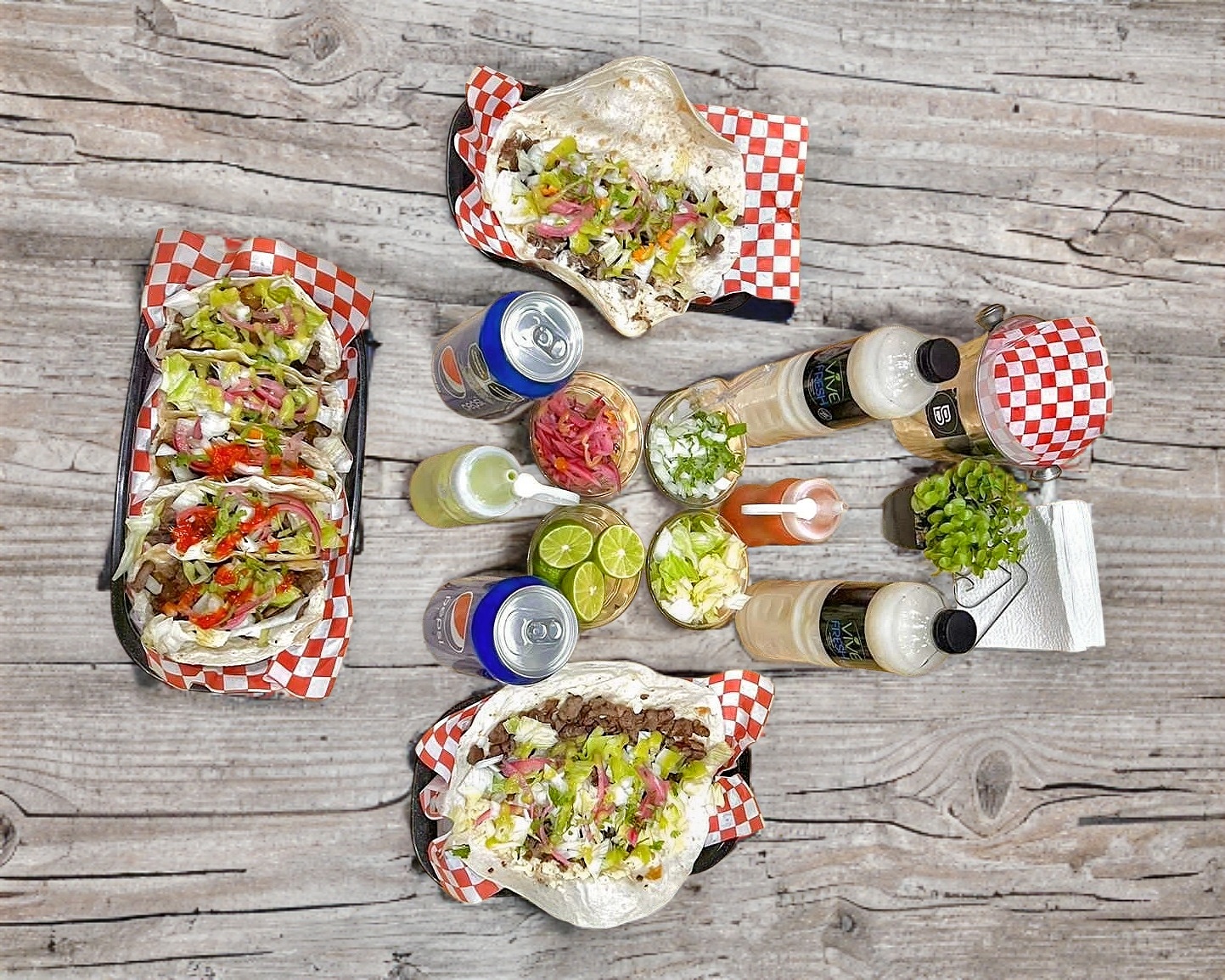 5 Tacos de carne asada. Acompañados con cebollitas, limones, salsa y lechuga.