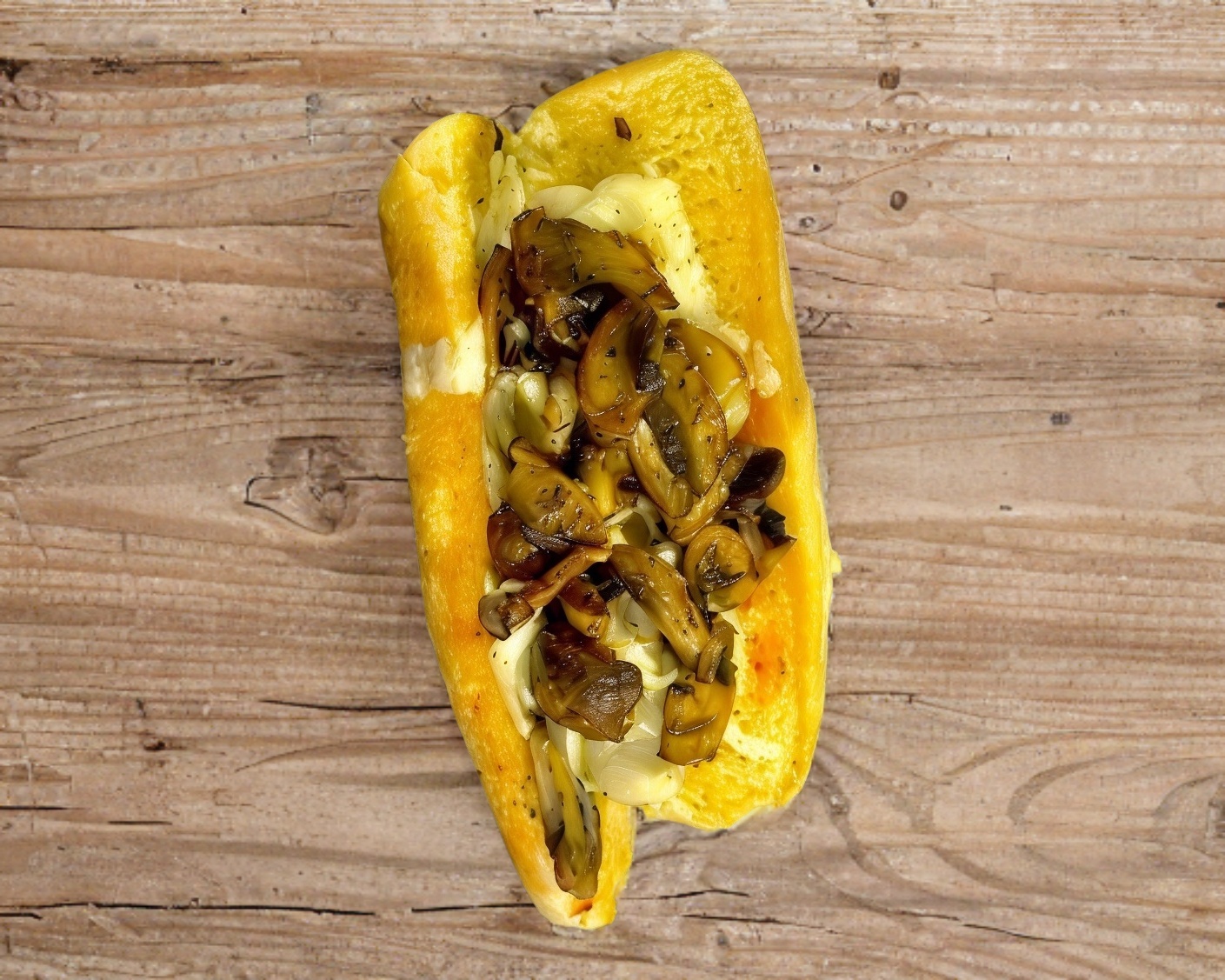 Salchicha, tocino, champiñones sazonados gratinados con queso blanco, aderezo jalapeño.