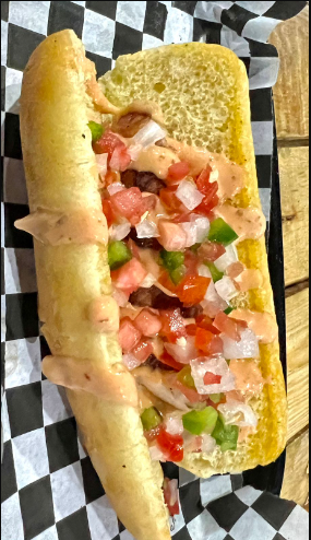 Salchicha, tocino, chile, tomate, cebolla y aderezo chipotle.