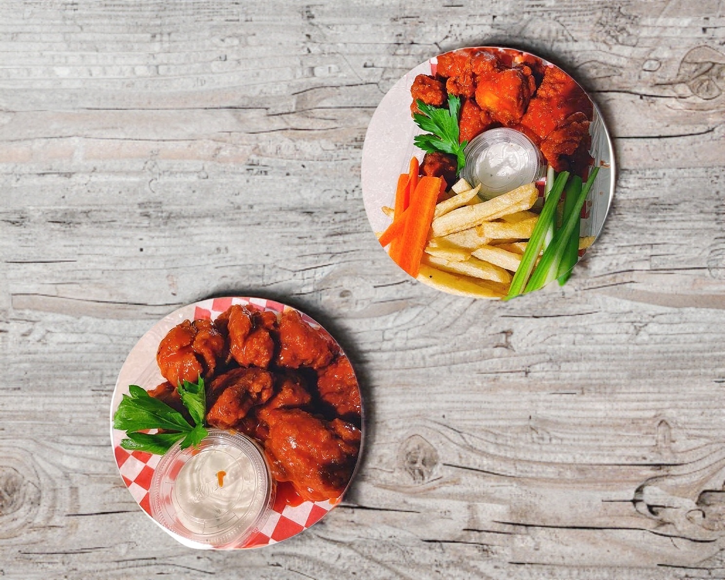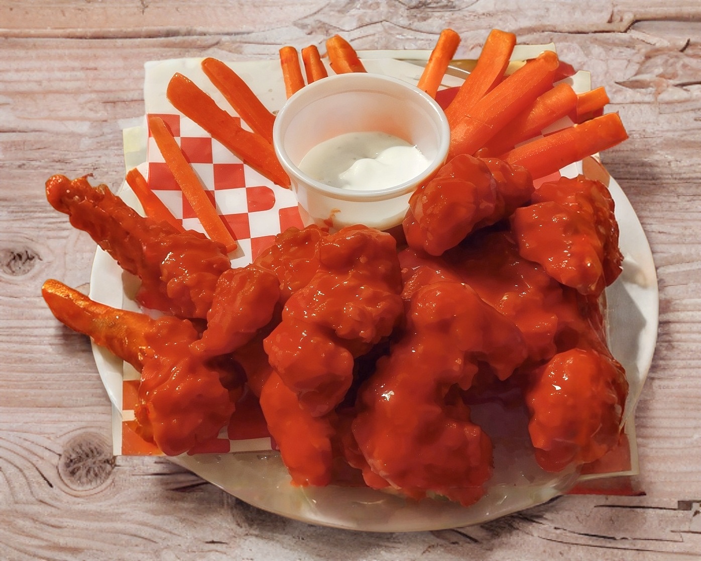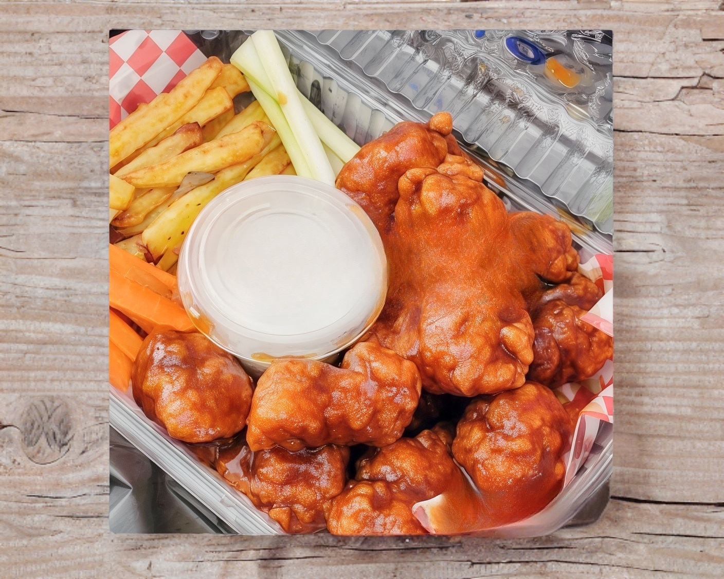 900 GR BONELES, BUFALO,BBQ, MANGO HABANERO, 3 ORDENES PAPAS A LA FRANCESA, 3 ADEREZO RANCH .