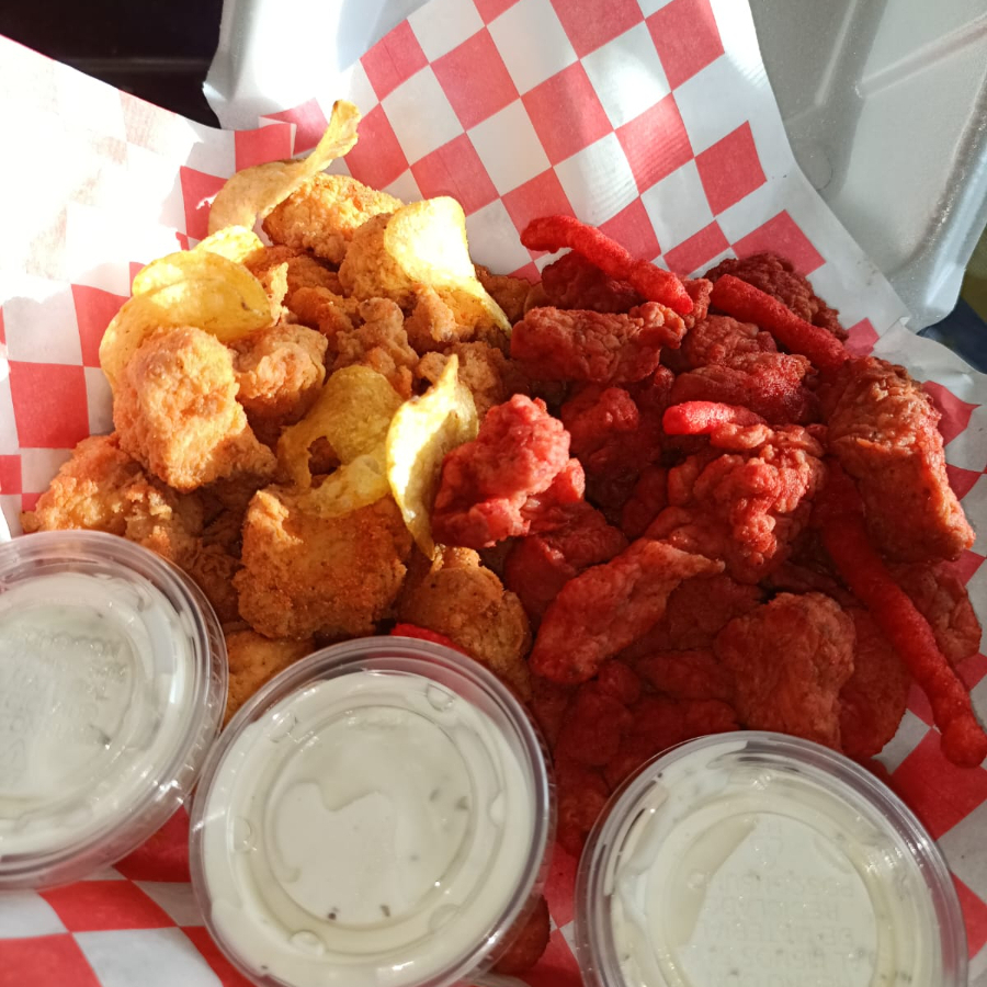 250 gr (18 aprox) De pechuga de pollo, cubiertos con empanizado crujiente y sazonador de Takis blue heat , acompañado por aderezo ranch y vegetales.