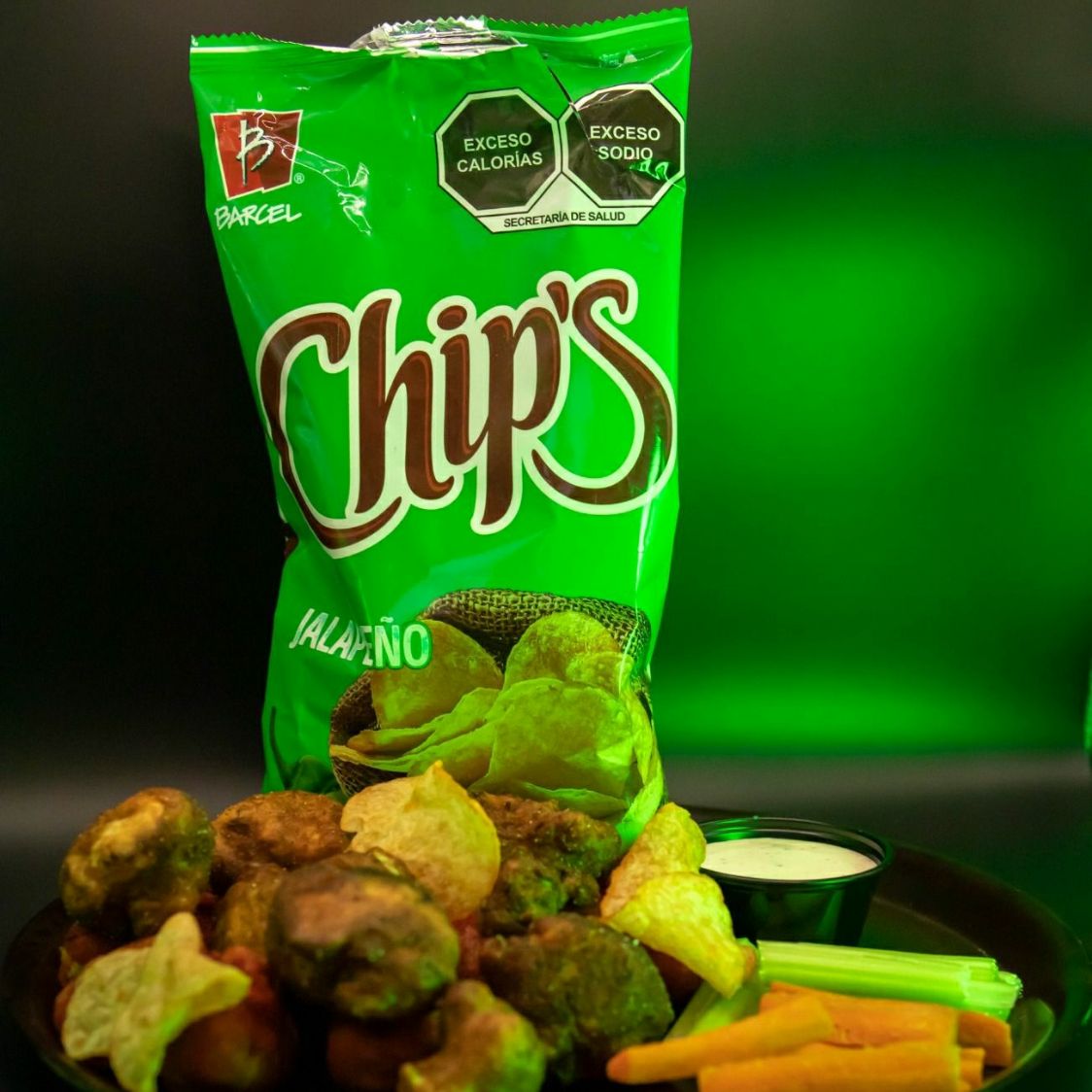 250gr (de 17 a 20 piezas) De pechuga de pollo, cubiertos con empanizado crujiente y sazonador de Chips verdes jalapeño, acompañado por aderezo ranch y vegetales.