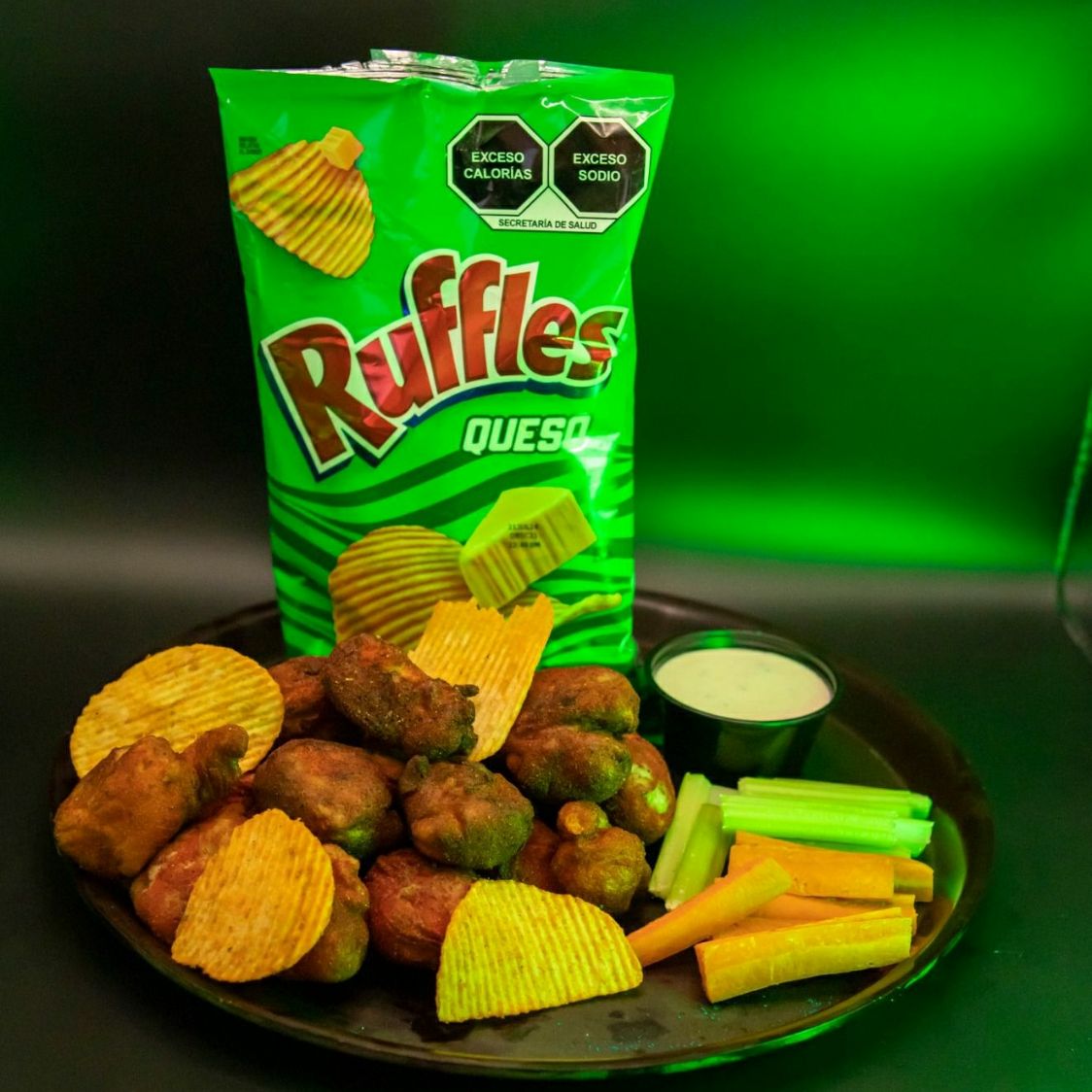 250 gr De pechuga de pollo, cubiertos con empanizado crujiente y sazonador de Ruffles de queso, acompañado por aderezo ranch y vegetales.