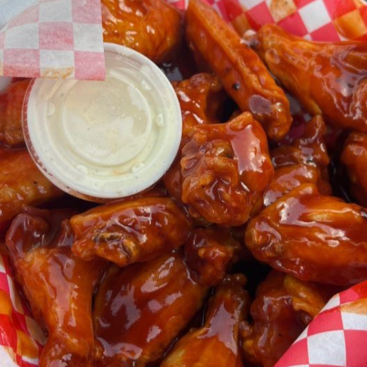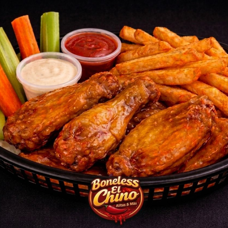 500g de Alitas JUMBO (8pz) bañaditas en salsa + 1 orden de papas fritas (150g) con tu sazonador favorito + Aderezo Ranch + Ketchup + apio y zanahoria.