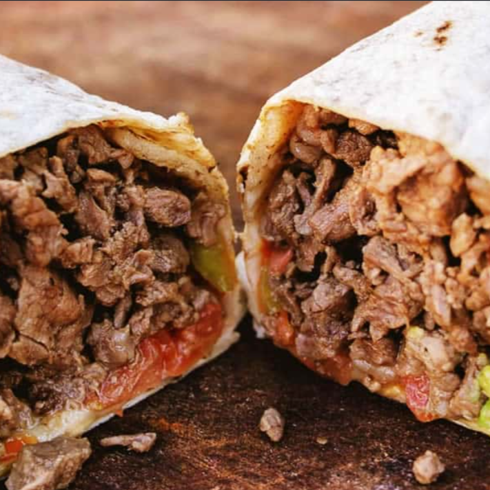 Deliciosa tortilla de harina rellena de carne asada, tocino y pimiento