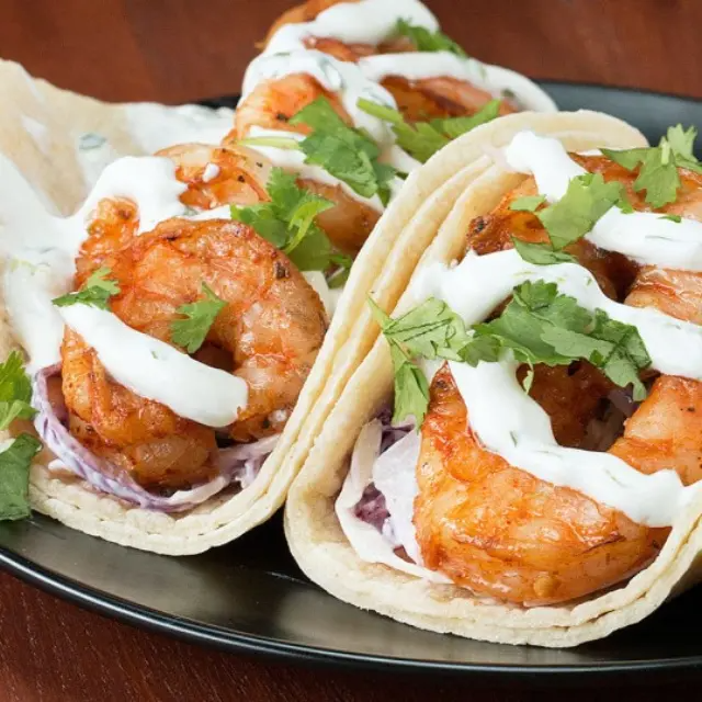 Tacos bien reportados de camarón con un delicioso aderezo