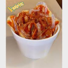 Papa natural acompañada con cueritos, pepino, salsas negras, clámato, salza valentia y clamato