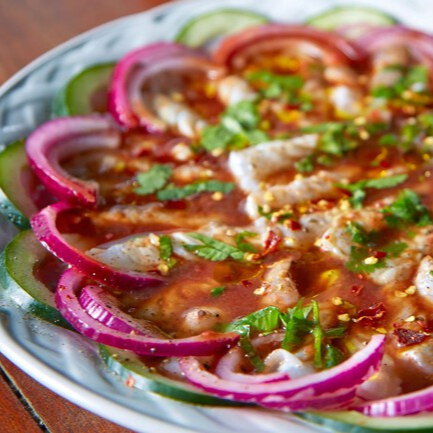 Especialidad de la casa carne jugosa, camaron condimentado. lechuga, tomate, y cebolla.