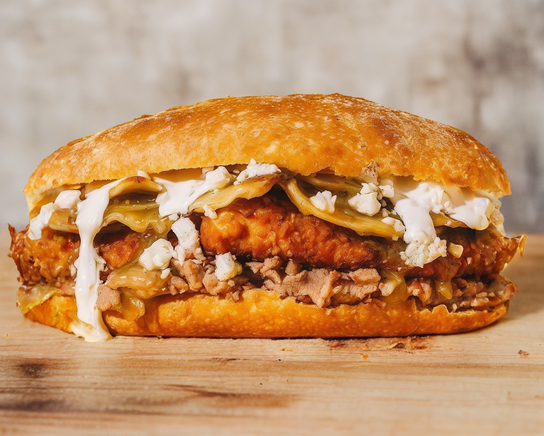 Pan, frijolito, milanesa de pechuga, chilaquiles, crema, queso, cebolla morada, en el otro pan chicharrón prensado y un huevo estrellado tierno.
