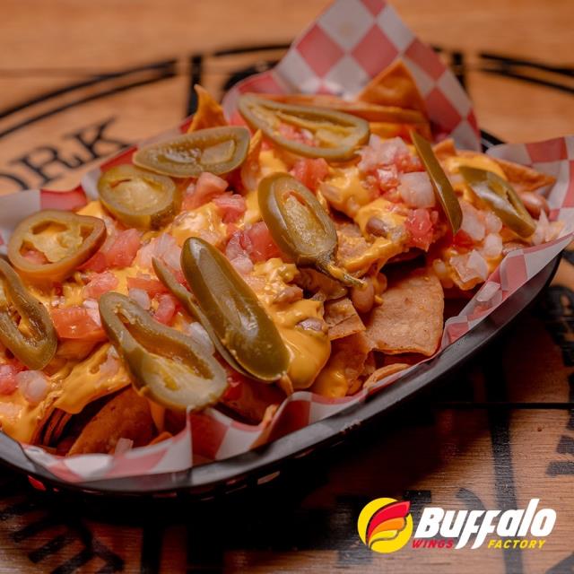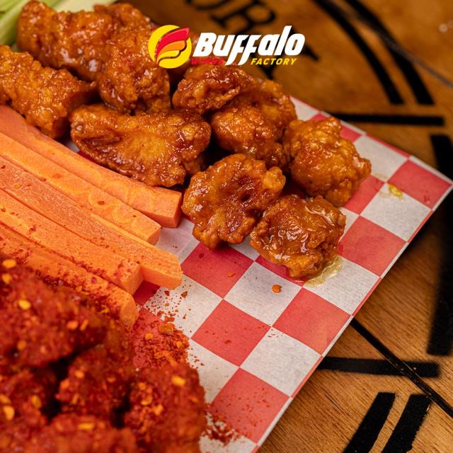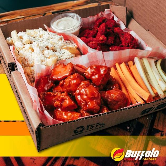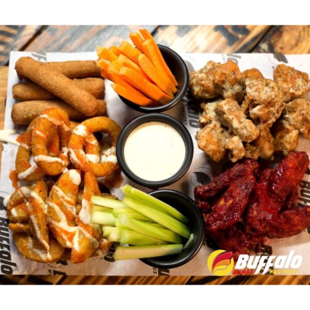 Alitas 250g, Boneless 250g, 4 Dedos de Queso, Papas Buffalo, 5 Onion Rings Y Vegetales. Nota. El peso de las Alitas y Boneless se calcula en crudo.