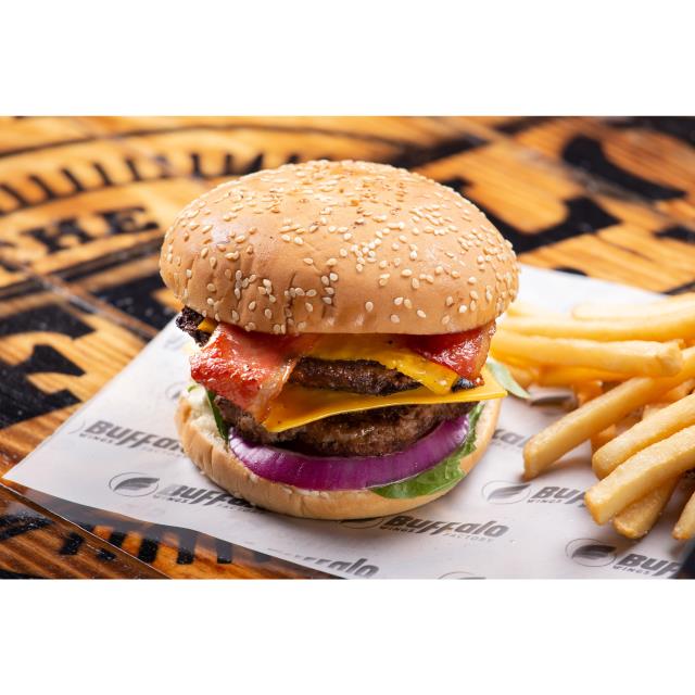 Hamburguesa Con Doble Carne De Res (240G), Doble Queso Amarillo, Tocino, Pepinillos, Lechuga, Tomate Y Cebolla.