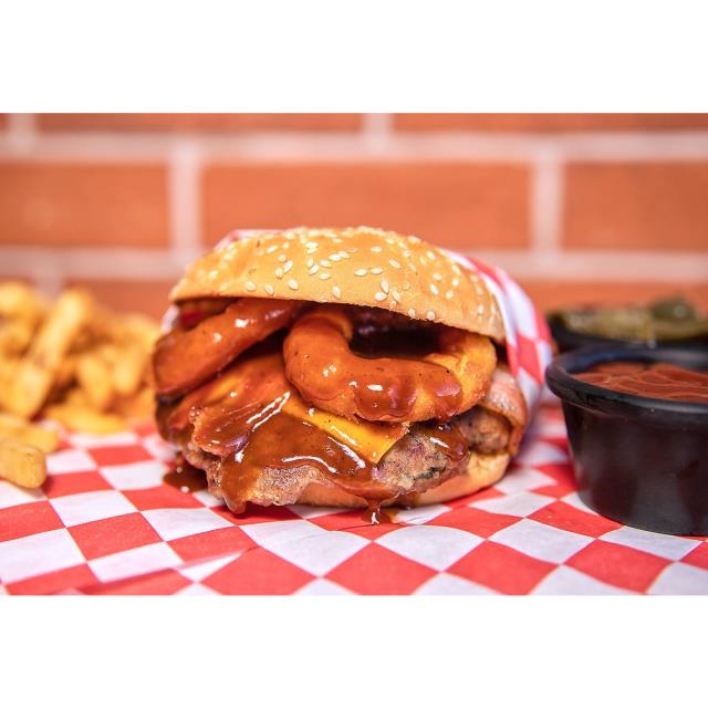 Hamburguesa De Res (120G), Tocino, Queso Amarillo, Aros De Cebolla Empanizados, Bañados En Salsa Bbq.