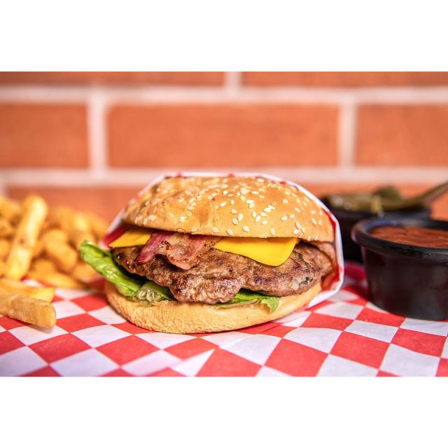 Hamburguesa De Res (120G), Tocino, Queso Amarillo, Lechuga, pepinillos, Tomate, Cebolla y Aderezo.