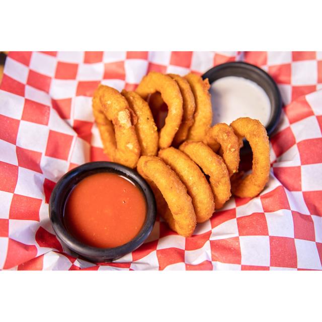 10 Deliciosos Aros De Cebolla Empanizados Bañados En Salsa Buffalo Y Aderezo.